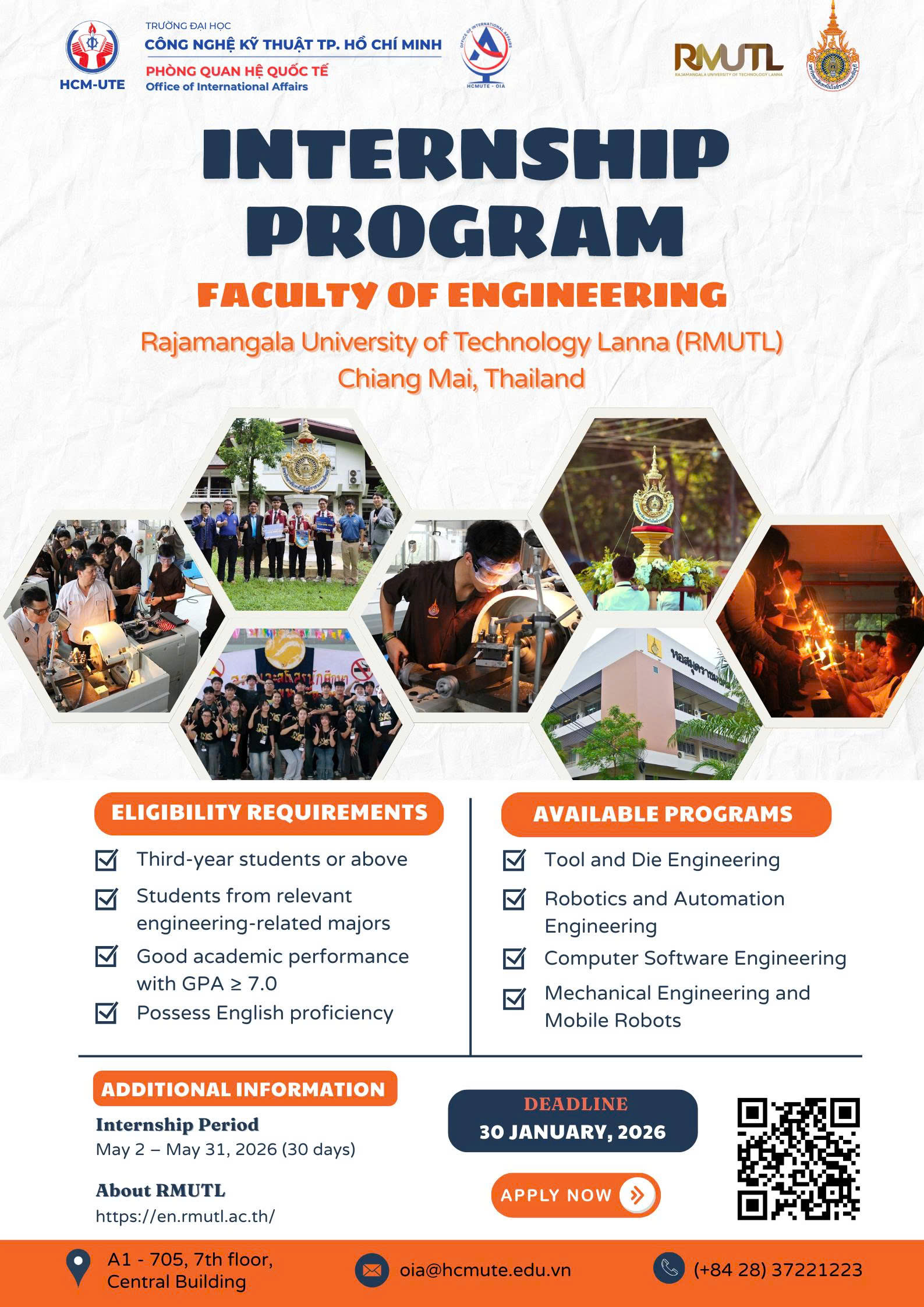The Office of International Affairs, Ho Chi Minh City University of Technology and Engineering (HCM-UTE), is pleased to announce a one-month internship program at the Faculty of Engineering, Rajamangala University of Technology Lanna (RMUTL), Chiang Mai, Thailand, tentatively scheduled for May 2026.