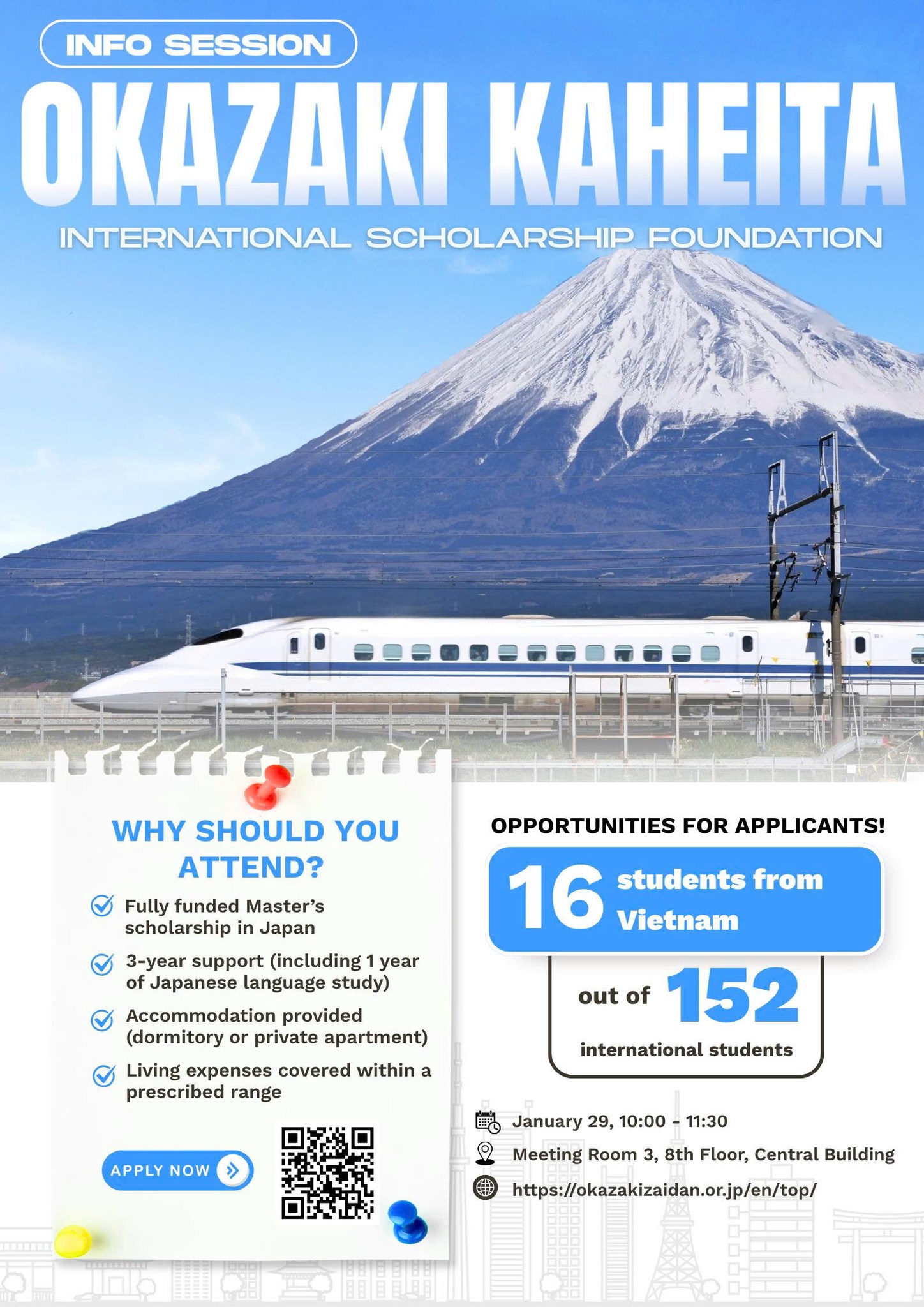 The Office of International Affairs (OIA) would like to inform students about the Okazaki Scholarship Information Session, which introduces the Okazaki Kaheita International Scholarship Foundation and provides outstanding students with opportunities to apply for a fully funded Master’s scholarship in Japan.